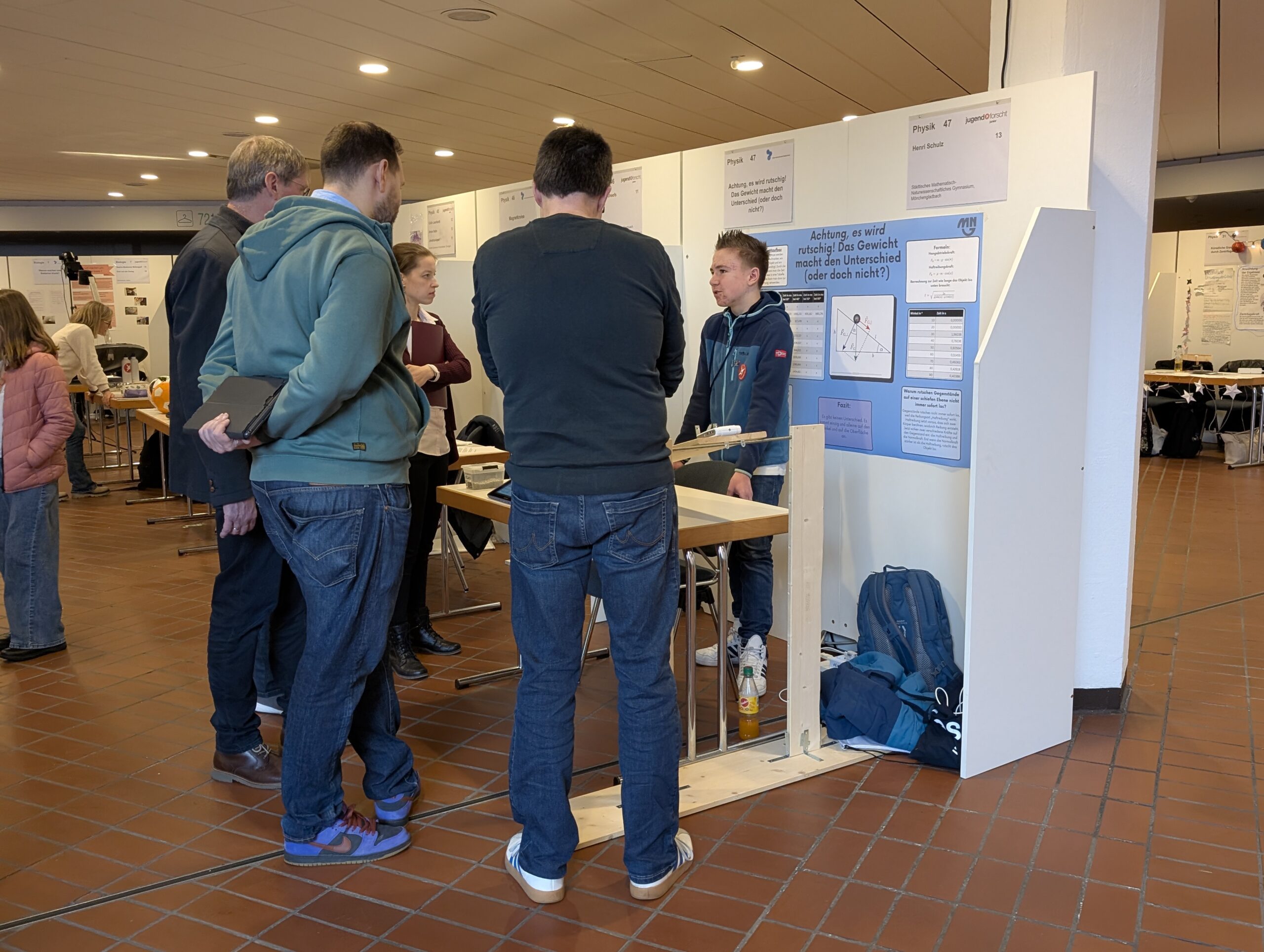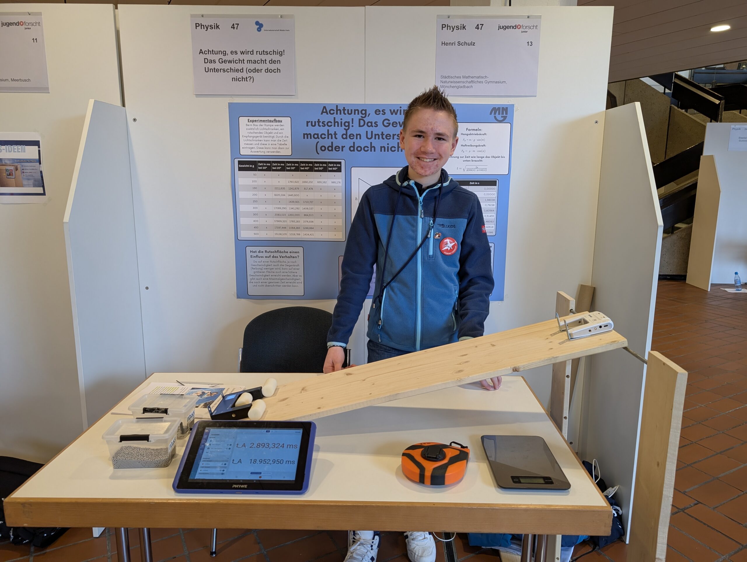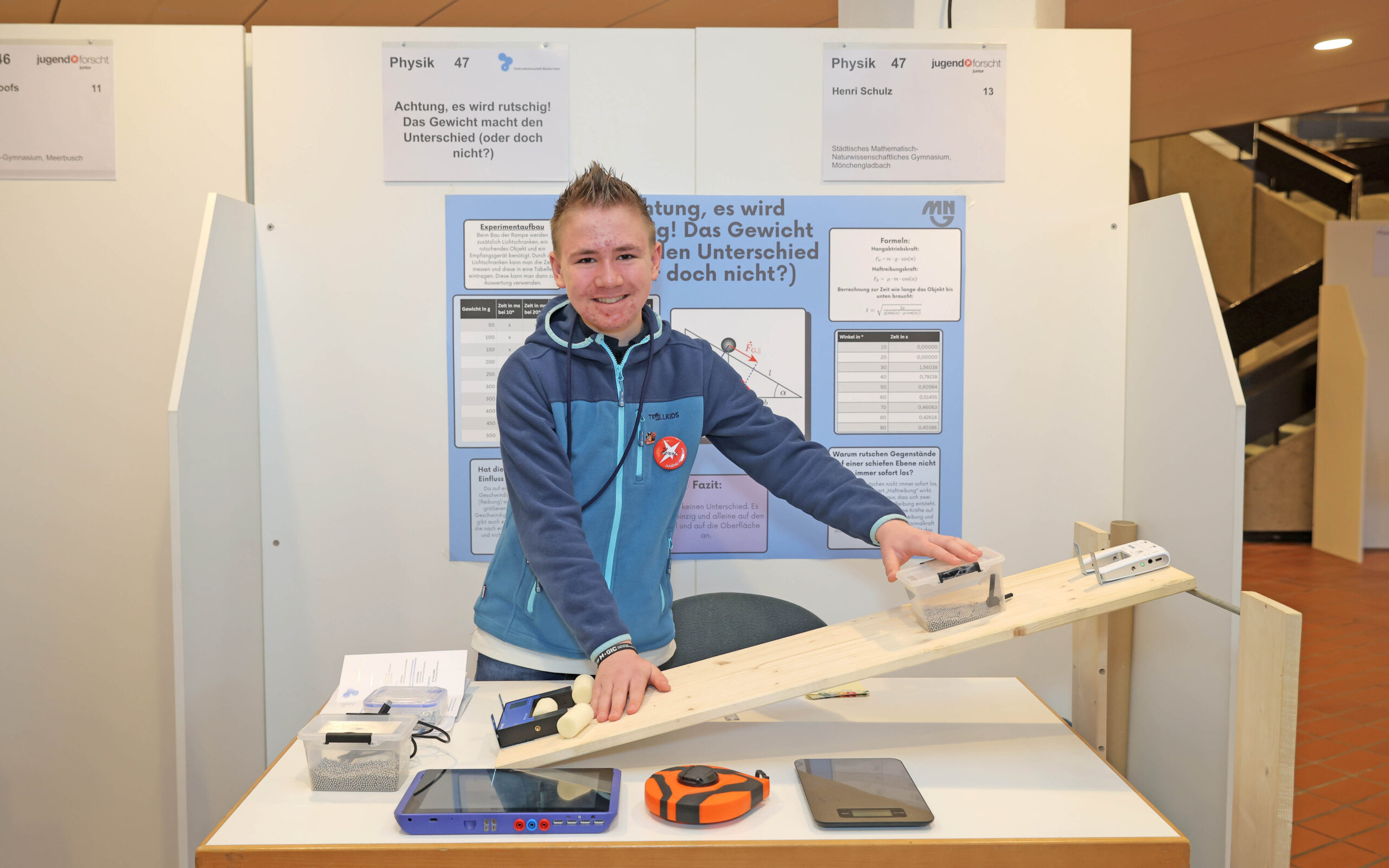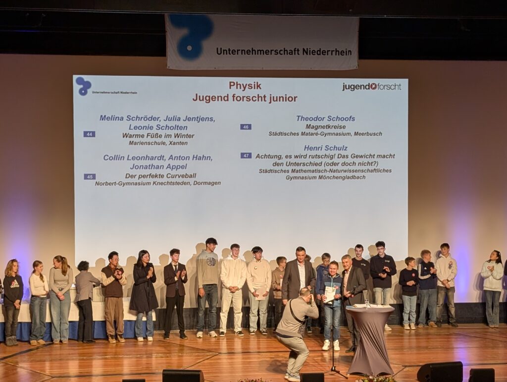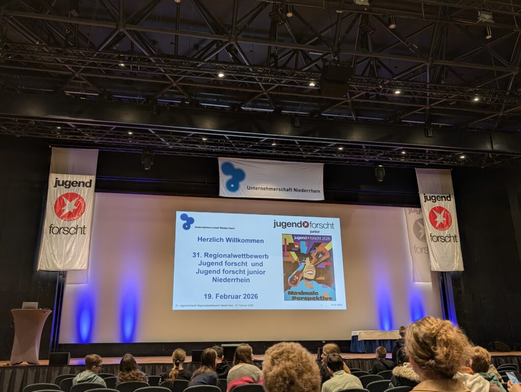 Am 19.02.26 fand zum 31.-mal der Jugend forscht Regionalwettbewerb in Krefeld statt. Henri Schulz (8a) hat sich mit seinem Projekt „Achtung, es wird rutschig! Das Gewicht macht den Unterschied (oder doch nicht?)“ erfolgreich qualifiziert. Dabei hat er unter anderem den Einfluss der Masse beim Herabrutschen eines Berges untersucht. Am Wettbewerbstag hat er die Jury mit seiner selbstkonstruierten schiefen Ebene, seinen ausgewerteten Daten und der Erkenntnis, dass sein Vater lediglich eine bessere Rutschtechnik beim Wettrutschen haben müsse, überzeugt. Auch unser Oberbürgermeister Felix Heinrichs folgte interessiert Henris Erkenntnissen und ließ sich ausführlich Henris Projektverlauf darstellen.