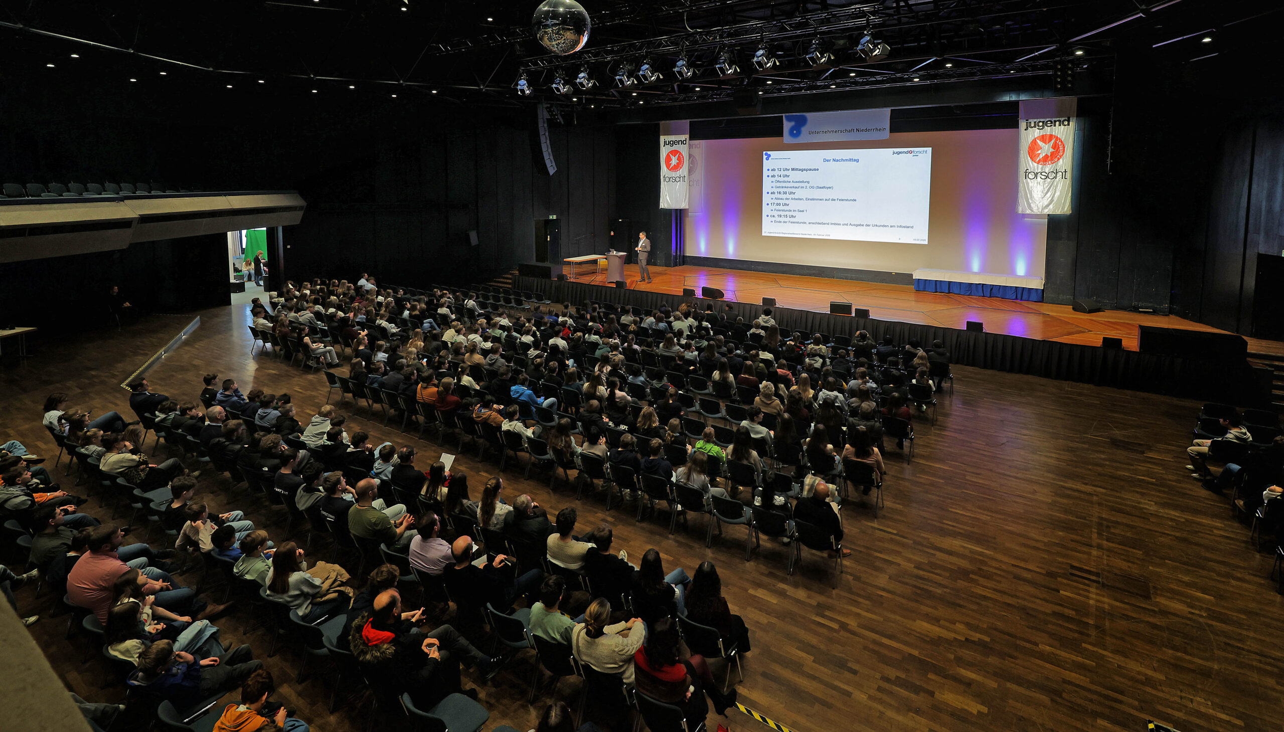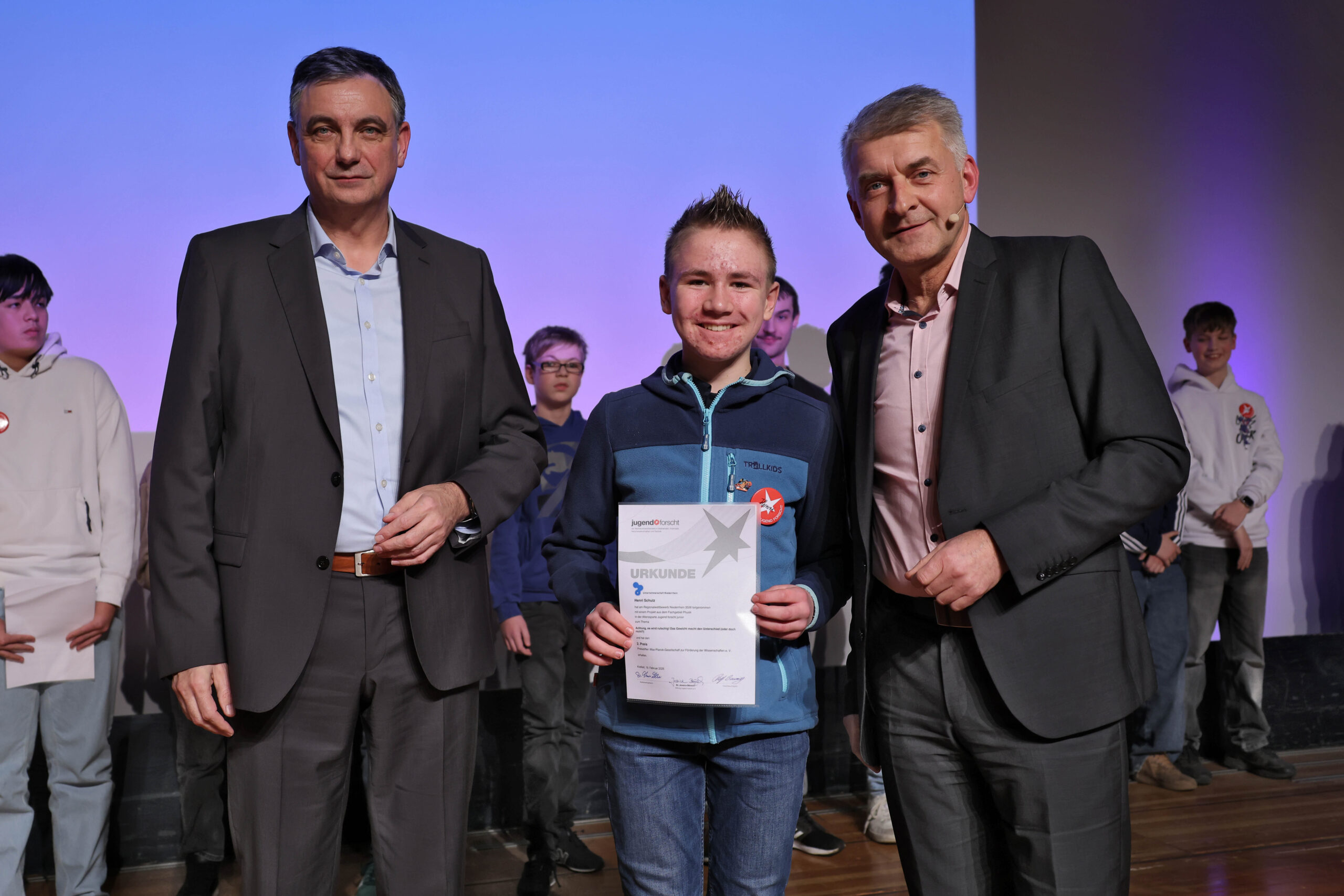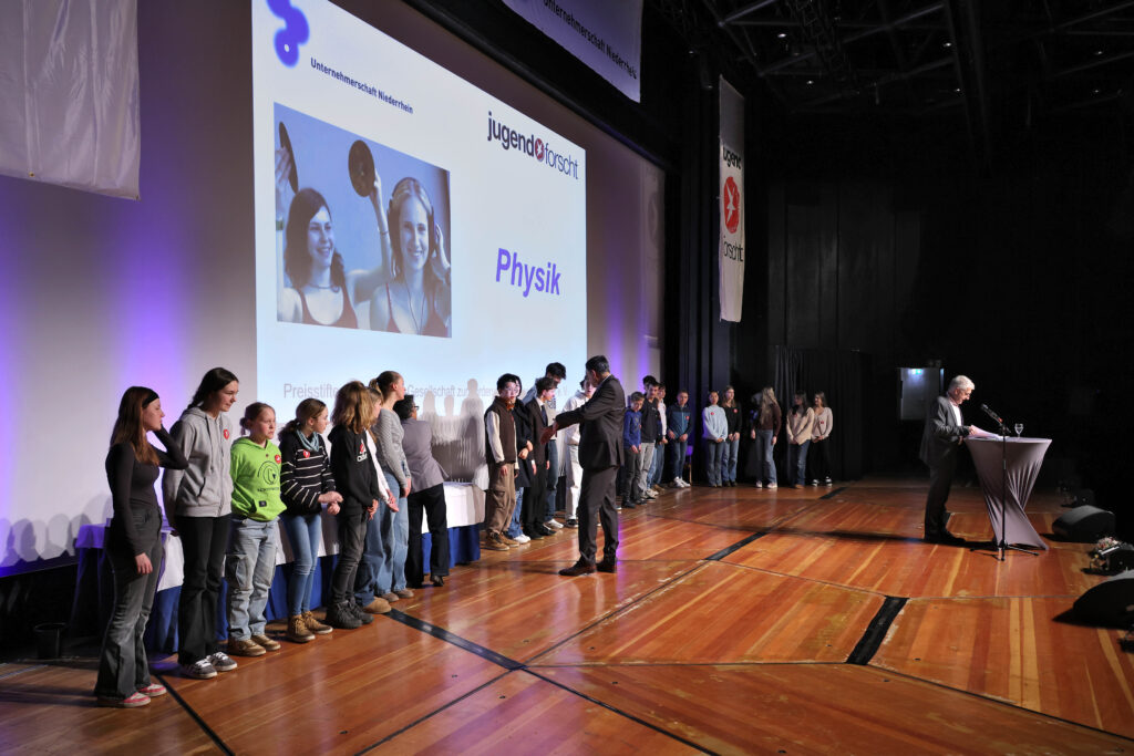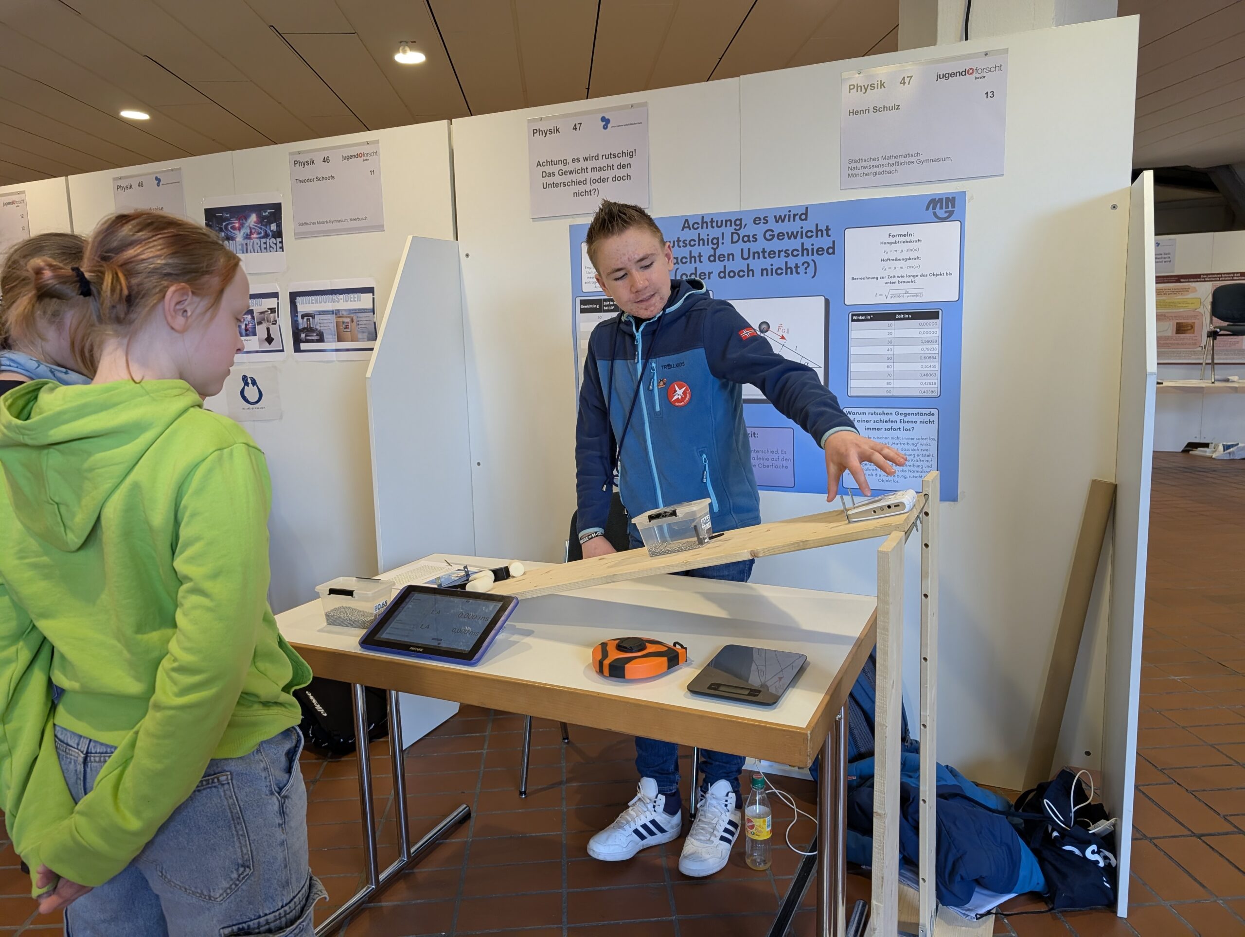 Am 19.02.26 fand zum 31.-mal der Jugend forscht Regionalwettbewerb in Krefeld statt. Henri Schulz (8a) hat sich mit seinem Projekt „Achtung, es wird rutschig! Das Gewicht macht den Unterschied (oder doch nicht?)“ erfolgreich qualifiziert. Dabei hat er unter anderem den Einfluss der Masse beim Herabrutschen eines Berges untersucht. Am Wettbewerbstag hat er die Jury mit seiner selbstkonstruierten schiefen Ebene, seinen ausgewerteten Daten und der Erkenntnis, dass sein Vater lediglich eine bessere Rutschtechnik beim Wettrutschen haben müsse, überzeugt. Auch unser Oberbürgermeister Felix Heinrichs folgte interessiert Henris Erkenntnissen und ließ sich ausführlich Henris Projektverlauf darstellen.